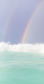 Rain strums the surface of the ocean and a double rainbow forms during a thunderstorm in Makena, Maui.